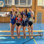 Aijana, Alia, Lina und Soraya starteten als Team in der Kategorie 3 an den Aargauer Mannschaftsmeisterschaften in Gipf-Oberfrick. Erstmals durfte wieder vor Publikum geturnt werden, was zusätzlich anspornte. Am Startgerät Boden konnten alle Vier ihre Leistung abrufen und überzeugten mit einer sauber ausgeturnten Übung. Alia punktete zusätzlich mit ihrer Ausstrahlung und wurde dafür mit einer 9.85 belohnt. Auch an den Schaukelringen zeigte das Team ihre Klasse, denn die super erturnte Note 9.55 von Soraya musste als Streichnote verbucht werden. Am Sprung konnten die Unsicherheiten, die sich beim Einturnen einschlichen, im Wettkampf gänzlich überwunden werden. Auch am letzten Gerät, dem Reck, konnte die Konzentration beibehalten werden. Dies gelang insbesondere Aijana und Lina, die mit ihrer kraftvollen und spritzigen Übung mit einer 9.55 und 9.75 zu einem spitzen Endergebnis beitrugen.